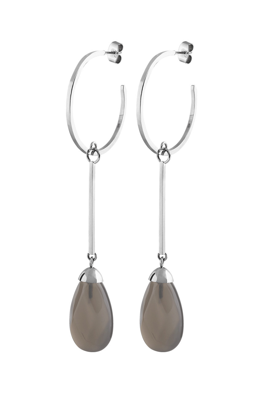 AKUA – Fantastiske hoop øreringe med den sejeste designdetalje; stålstang med dråbeformet halvædelsten. Vist her i et sølvtonet finish med grå opal. Nikkelfri dansk design. – Nikkelfri – Messing – Lås: Sommefuglelås (Læs mere)