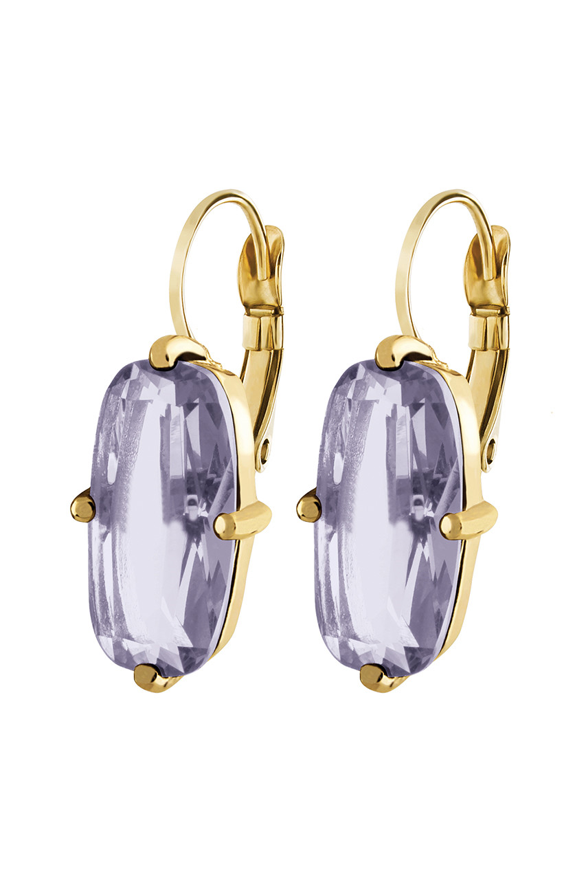 BARITA: Denne ørenring med sin smukke oversized rektangulære facetslebne krystal med rundede hjørner er smuk i al sin enkelhed. Her vist i en guldtonet version og lavendelblå krystal. Låsen er en fransk hook, som vi kalder den. Materialet er messing med e (Læs mere)
