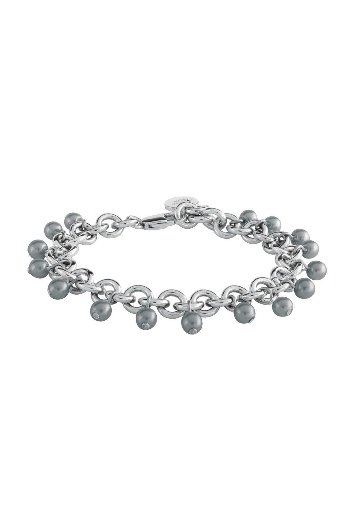 Feminint og elegant lænkearmbånd i en sølvtonet finish med små vedhæng af grå kunstperler. Et iøjnefaldende armbånd du kan bruge til alle lejligheder. Lukkes med karabinlås. – Armbåndet er fri for nikkel, cadmium og bly – Alle metaldele er designet i hånd (Læs mere)