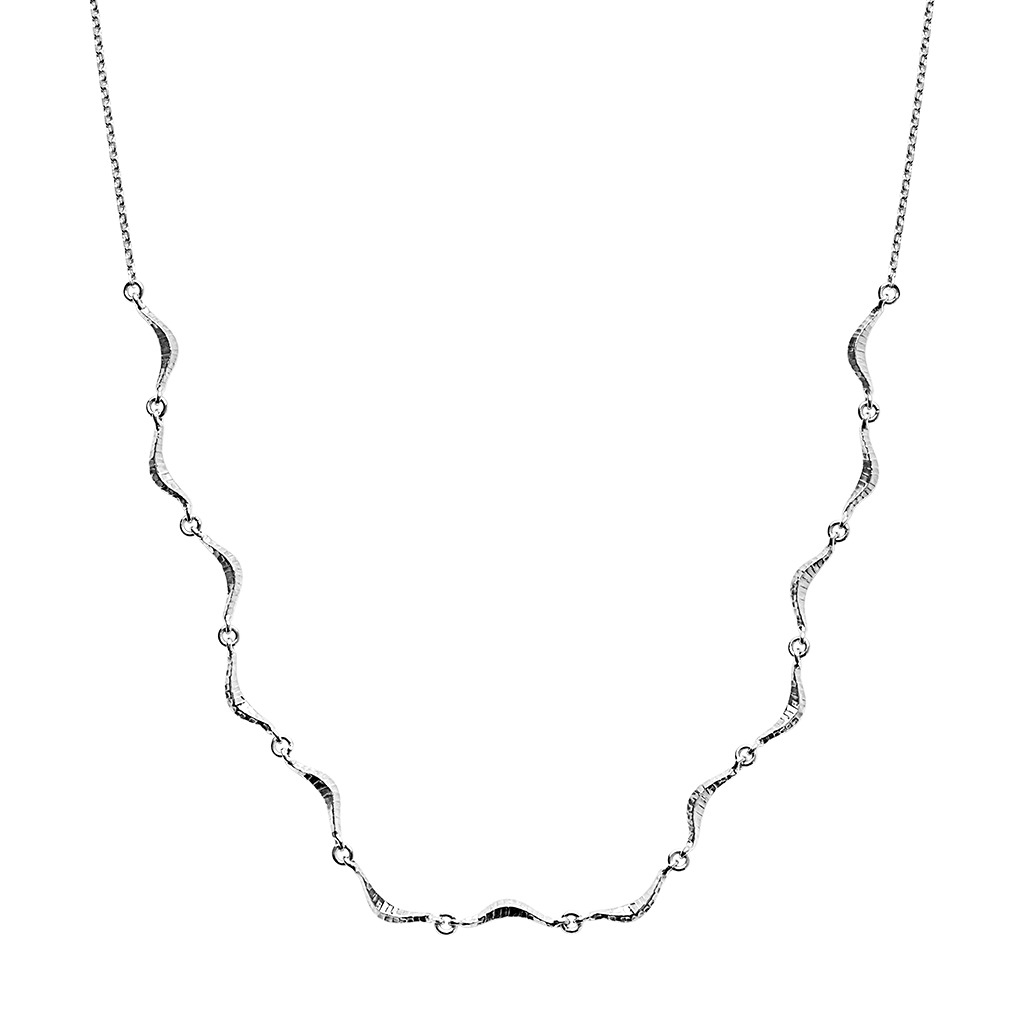 Smuk og elegant Ula halskæde fra Maanesten i ægte sterlingsølv.Den flotte halskæde har bølgende bevægelser og med en hamret overflade.Ula halskæden fra Maanesten måler 41 centimeter i længde. (Læs mere)